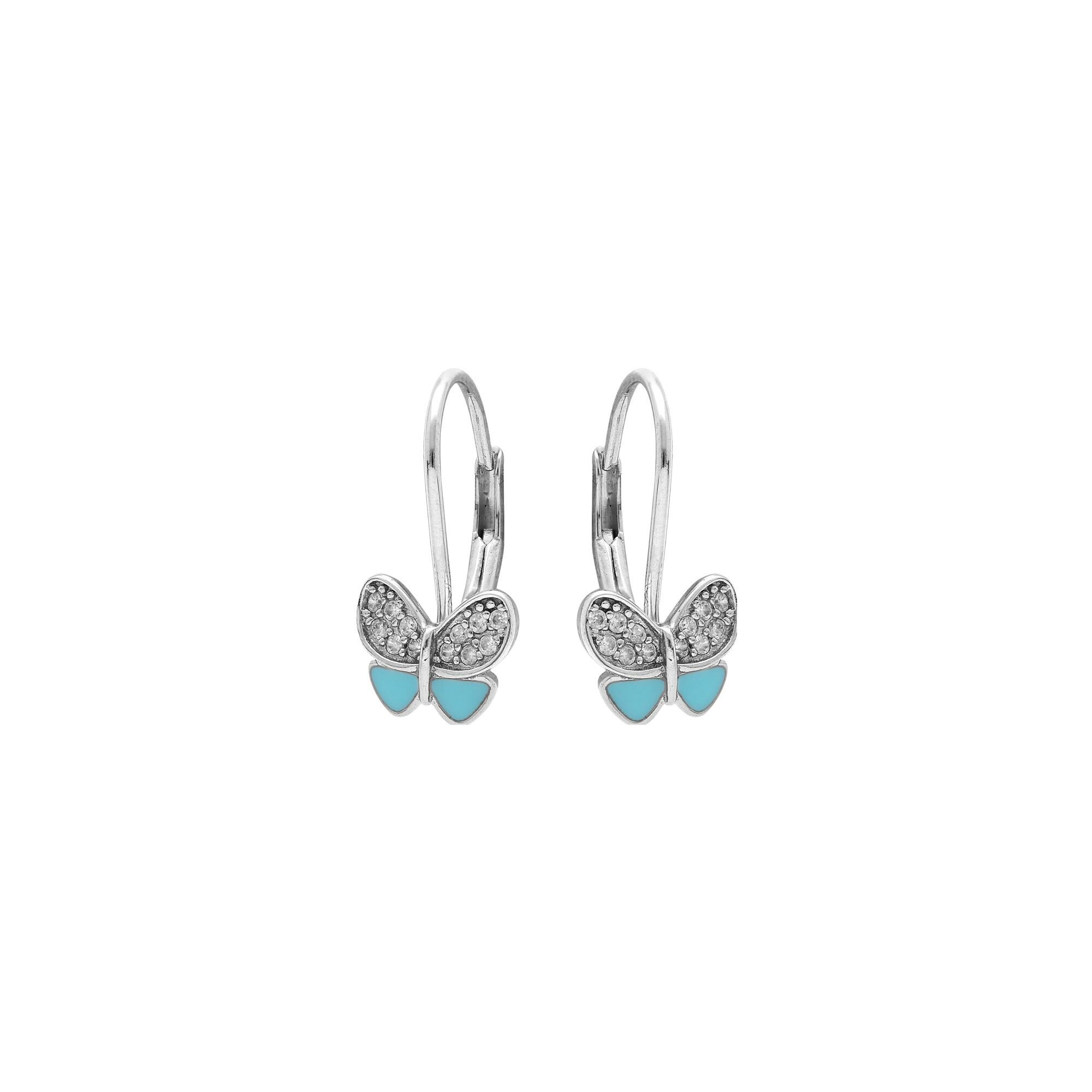 Boucles d'oreilles dormeuse argent rhodié papillon résine bleu ciel et oxydes blancs